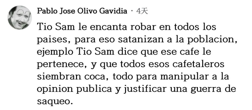 网友巴勃罗·奥利沃留言说:“山姆大叔喜欢在所有国家盗窃,为此他们妖魔化民众,譬如山姆大叔说那片咖啡园是属于他的,还说所有那些咖啡农在种植古柯,所有这一切都是为了操弄舆论,为了给他们的掠夺战争辩护。”