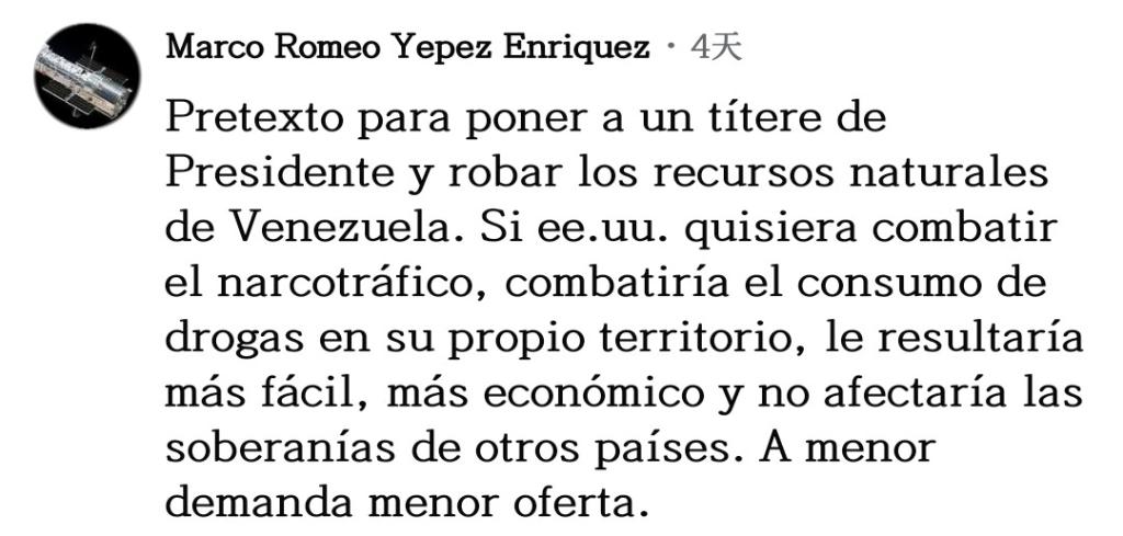 网友马尔科·耶佩斯直言不讳:“所有一切不过是美国安插傀儡以掠夺委内瑞拉自然资源的借口罢了。如果美国真想打击贩毒,就应该去打击自己领土上的毒品消费,这样更简单、更经济,也不会影响其他国家的主权,需求减少供应自然也会下降。”