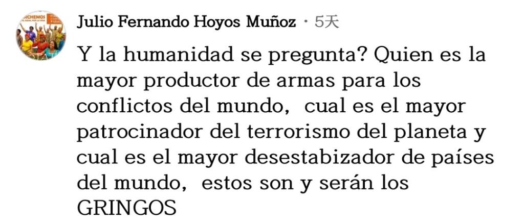 网友胡里奥·奥约斯接连发问:“没有人去责问吗?谁是为世界各地冲突提供武器的全球最大武器制造者?谁是地球上最大的恐怖主义活动支持者?谁是世界上最大的不稳定因素制造者?答案无论在现在还是将来,都是美国。”