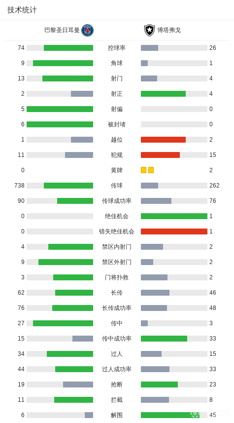 整场比赛,巴黎控球率高达74%,但光打雷不下雨,巴黎空有场面,实际射正还没对手多。克瓦拉茨赫利亚在左路冲了几次,两次摔在禁区边上裁判都没给点球。博塔弗戈也清楚自身实力安心打反击,第36分钟一次偷袭,热苏斯接直塞捅射破门锦富优配,多纳鲁马连扑救动作都没做出来。