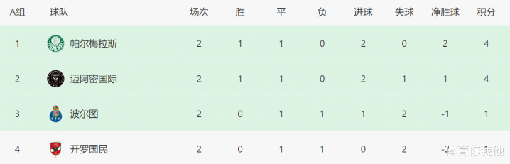 截至目前,在A组积分榜上,迈阿密国际和帕尔梅拉斯同积4分,因为净胜球少1个,迈阿密国际只能排名第二。由于领先身后的波尔图和开罗国民3分,最后一轮比赛,迈阿密国际对阵帕尔梅拉斯,只要保持不败,他们就肯定能够出线。